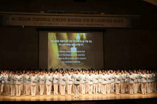 나이팅게일 선서식은 내년 2월 졸업을 앞둔 학생들이 졸업메달을 수여받는 동시에 스승으로부터 촛불을 이어받으며 나이팅게일의 진정한 희생과 봉사정신을 되새기고 헌신하는 간호사가 될 것을 다짐하는 건양대 간호대학의 전통행사다.