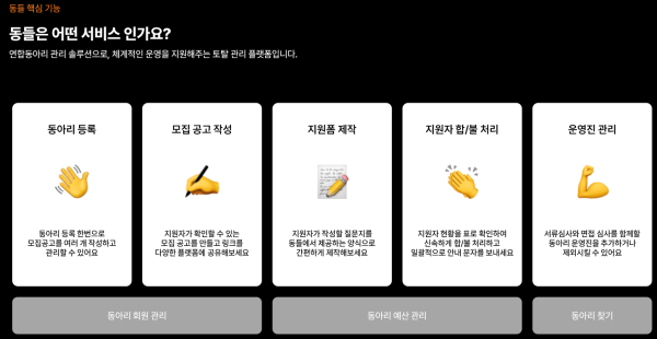 ‘동들’은 연합동아리의 토털솔루션 플랫폼을 목표로 동아리 회원 선발 기능을 포함한 커뮤니티 기능을 제공하고 있다.