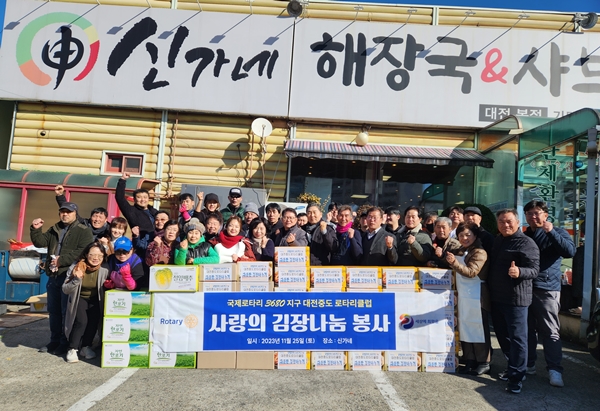[충청뉴스 이성현 기자] 지난 25일 국제로타리 3680지구 대전 중도로타리클럽(회장 최민호)은 사랑의 김장나눔행사를 진행했다. 이번행사는 대전 중도로타리클럽 회원들과 부인회 한밭대학교 로타렉트회원 60여명이 함께 했다. 회원들이 서로서로 김장재료를 후원하여 진행하여 더욱 뜻깊은 행사로 기억되게 되었다.