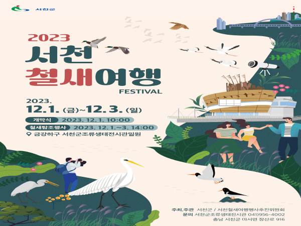 [충청뉴스 서천 = 조홍기 기자] 대한민국을 대표하는 철새들의 휴식지 금강하구와 서천갯벌 일원에서 오는 1일부터 3일까지 ‘2023 서천철새여행’ 페스티벌이 펼쳐진다.