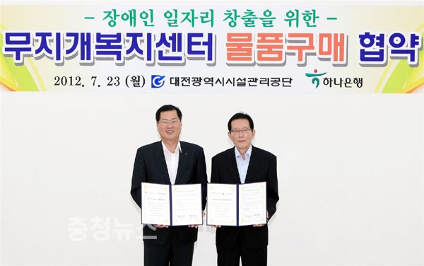대전시설관리공단(이사장 한종호)과 하나은행 충청사업본부(대표 박종덕)는 23일 오전 무지개복지센터에서 장애인생산품 구매협약을 체결했다.