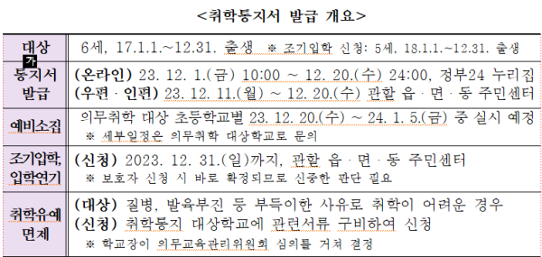 입학 예정 아동을 둔 보호자(세대주)는 오는 1일 아침 10시부터 20일 밤 24시까지 정부24 누리집(https://www.gov.kr)을 통해 온라인 취학통지서를 발급받을 수 있다. 또한, 12월 11일부터 취학통지 누락 방지 및 입학을 위한 추가자료 발송을 위하여 온라인 취학통지서 발급과 상관없이 취학통지서가 우편(등기) 또는 인편으로 발송된다.