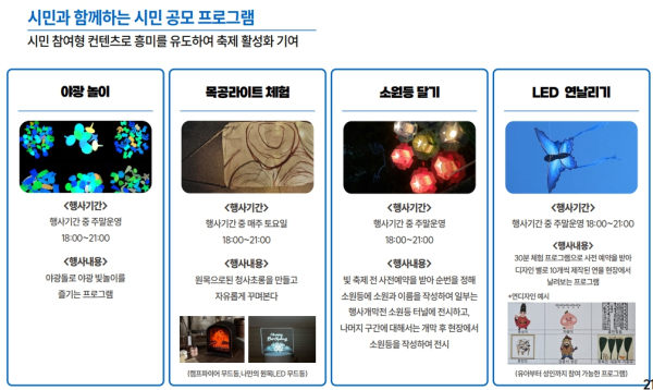 - 축제 기간 중 매주 토 원목청사초롱, 캠프파이어무드등, 원목엘이디(LED)무드 등 총 3가지 제작 프로그램 진행