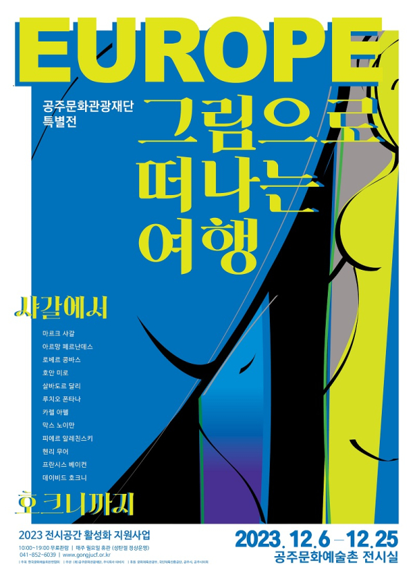 'Europe:그림으로 떠나는 여행'은 문화체육관광부 산하 한국문화예술회관연합회에서 주관하는 ‘2023년 전시공간 활성화 지원사업’에 선정되어 진행하는 전시다. 공주문화관광재단은 해당 지원사업을 3년 연속 유치하며 매년 공주 시민의 수준 높은 문화향유를 위한 우수전시를 유치하고 있다.