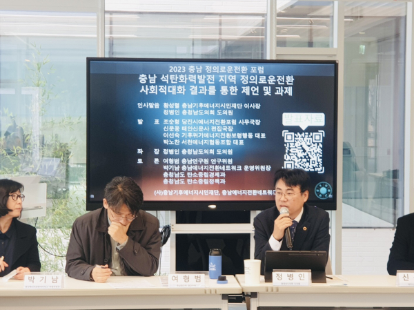 [충청뉴스 권상재 기자] 충남도의회 정병인 의원(천안8·더불어민주당)은 12일 충남기후에너지시민재단과 충남에너지전환네트워크에서 주관한 「2023 충남 정의로운전환 포럼」에서 좌장을 맡아 그간 ‘충남 석탄화력발전 4개 지역의 정의로운전환 사회적 대화 결과’ 내용을 듣고 충남의 석탄화력발전 폐지에 따른 민ㆍ관의 지속적인 정의로운전환을 요청했다.