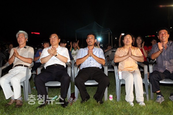 지난 2일 밤 10시 홍성군청 후정에 마련된 공동응원전 현장에는 홍성이 낳은 명궁 이성진 선수의 금메달을 기원하는 3백여 홍성군민들의 함성이 가득 찼다.