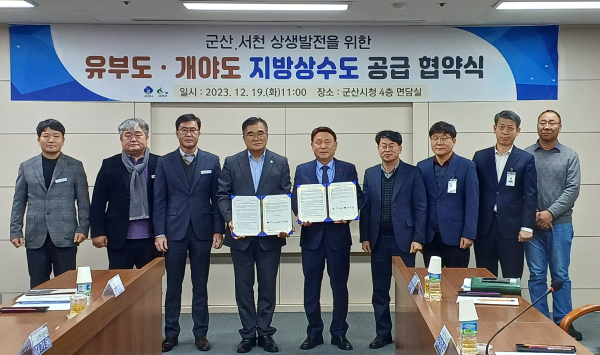 [충청뉴스 서천 = 조홍기 기자] 서천군과 군산시가 19일 군산시청에서 유부도와 개야도의 고질적인 식수난 해결을 위한 도서 지역 지방상수도 공급 협약을 체결했다.