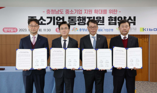 도는 26일 도청 상황실에서 김태흠 지사와 김성태 IBK기업은행장, 심현구 신용보증기금 전무이사, 이종배 기술보증기금 전무이사가 ‘중소기업 동행지원 협약’을 체결했다고 밝혔다.