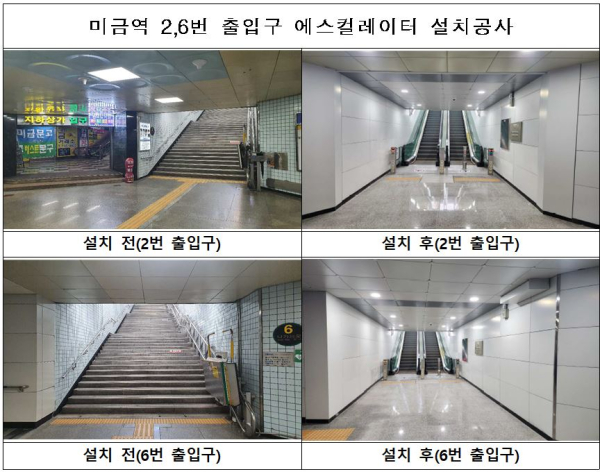 이에, 공단은 여객서비스 향상을 위해 지난 2021년 에스컬레이터 설치공사를 착수하였으며, 지장물 이설과 굴착 범위 내 인접 건물 등 난관을 해결하고 당초 계획대로 공사를 완료하여 미금역 2번과 6번 출입구에서 상하행 에스컬레이터를 모두 이용할 수 있게 되었다.