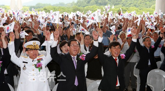 ▲ 안 지사와 광복회원 등 1000여명이 제67주년 광복절을 축하하는 만세삼창을 하고 있다.