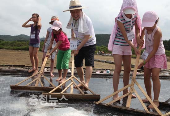 첫날, 염전체험에서는 무더운 날씨로 염전 바닥이 매우 뜨거웠지만, 학생들은 용감하게 맨발로 들어가 하얀 소금을 고무래로 밀고 당기며 소금이 만들어지는 과정을 체험했다.