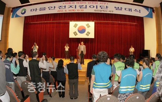 대전광역시 서구(구청장 박환용)는 최근 올레길 여성 피살 사건 등을 계기로 주민들이 안심하고 생활할 수 있는 범죄 없는 안전한 서구를 만들기 위하여 민·관·경 4백여명이 참석한 가운데 서구청 대강당에서 ‘마을안전지킴이단 발대식’을 개최했다.