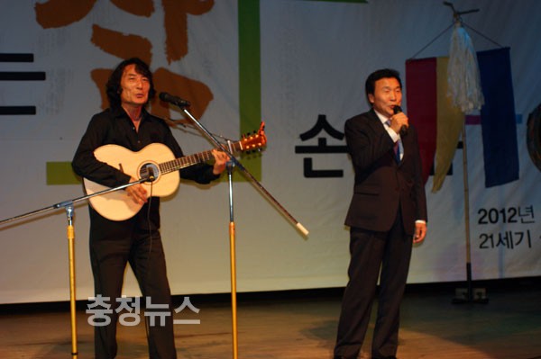 ▲ '저녁이 있는 삶’노래를 헌정한 박치음씨와 손학규 후보가 노래를 부르고 있다.