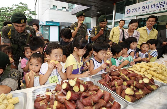 대전광역시 유성구(구청장 허태정)는 을지연습 첫날인 20일 오후 전후세대에게 전시 간접체험의 계기를 마련해주기 위해 구청 현관에서 구청을 방문한 주민과 어린이 3백여 명을 대상으로 옥수수, 고구마, 건빵 등을 제공하는 비상급식 체험훈련을 가졌다.