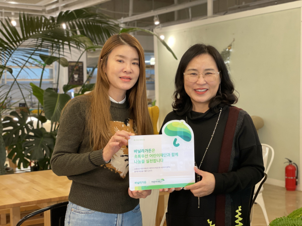 바닐라가든 장윤실 사장은 “같은 건물에 있는 초록우산의 활동을 응원하는 마음으로 정기후원에 참여하게 되었다”라며, “우리 지역의 어려운 아이들을 돕는 일에 힘이 되고 싶다”라고 말했다.