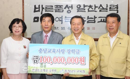 충남교육청(교육감 김종성)은 23일 오전 교육감 접견실에서 충북 청주에 사는 전병환씨로부터 장학금 1억원을 기탁받았다고 밝혔다.