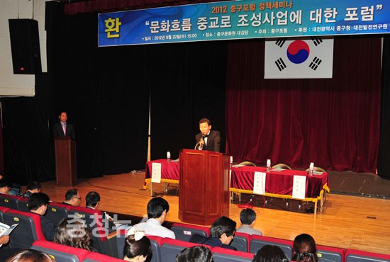 대전광역시 중구(구청장 박용갑)는 22일 중구문화원 뿌리홀에서 ‘문화흐름 중교로 조성사업’과 관련해 박용갑 중구청장, 이창기 중구포럼 수석대표, 강호계 공동대표 등 2백여명이 참석한 가운데 정책세미나를 개최했다.
