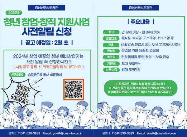 [충청뉴스 권상재 기자] 충남신용보증재단(이사장 김두중, 이하 충남신보)은 충청남도와 충남신보가 시행 예정인 ‘2024년도 충청남도 청년 창업․창직 지원사업(생활업종)’에 대한 사전알림 신청 서비스를 시행한다고 밝혔다.