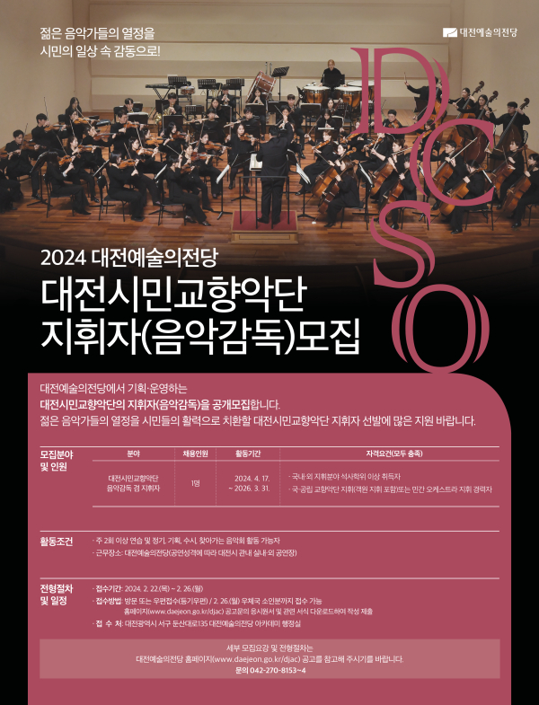 [충청뉴스 박영환 기자] 대전예술의전당(관장 김덕규)은 2024년 대전시민교향악단 제2대 음악감독 겸 지휘자를 다음달 22일부터 26일까지 공개 모집한다.