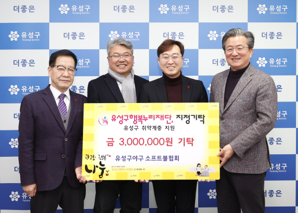 [충청뉴스 박영환 기자] 대전 유성구(구청장 정용래)는 23일 유성구야구소프트볼협회(회장 송현섭)가 저소득층 가정 지원을 위한 후원금 300만원을 유성구행복누리재단에 기탁했다고 밝혔다.