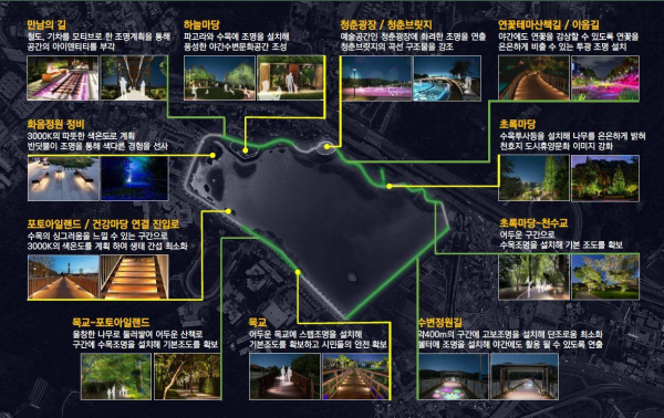 또 청춘광장과 천수교에 경관조명을 설치하고 예술의 섬, 연꽃산책길, 초록마당에 테마산책길과 무장애 산책로 등을 조성한다.