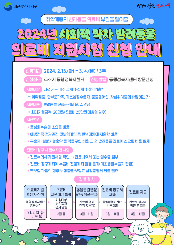 [충청뉴스 박영환 기자] 대전 서구(구청장 서철모)는 취약계층의 반려동물 의료비 부담을 덜기 위해 2월부터 ‘사회적 약자 반려동물 의료비 지원사업’을 추진한다고 25일 밝혔다.
