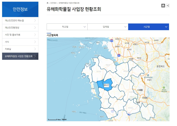 해당 기능은 충남교육청 재난안전관리 누리집에서 제공하고 있으며, 학교로부터 반경 5km 내의 유해화학물질 사업장의 위치 지도와 거리 정보, 취급물질 종류 등을 손쉽게 조회할 수 있도록 학교별, 업체별, 지역별 검색 기능으로 구성되었다.