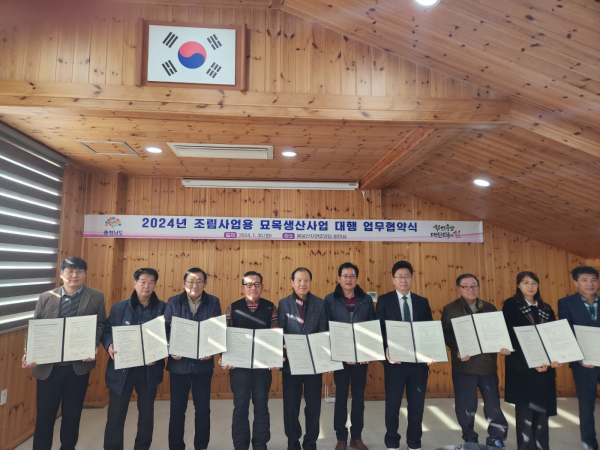 [충청뉴스 권상재 기자] 충남도는 30일 홍성 용봉산 자연휴양림 회의실에서 윤효상 산림자원과장과 지승배 한국양묘협회 충남도지회장, 묘목생산사업 대행자 등이 참석한 가운데, ‘2024년 조림사업용 묘목생산사업 대행 업무 협약’을 체결했다.