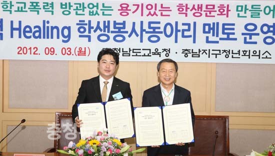 충남교육청(교육감 김종성)은 9월 3일 오후 2시 도교육청 회의실에서 충남지구청년회의소와 ‘학교폭력 방관자 없는 용기있는 학생문화 조성 협약’을 체결했다.