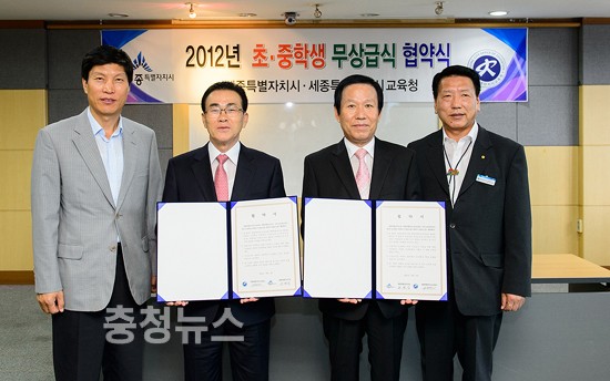 4일 유한식 세종시장과 신정균 세종시교육감은 시청 회의실에서 2012년도 하반기 초·중학교 무상급식 대상 확대와 예산 분담비율 등 무상급식 실시를 위한 협약서에 서명했다.