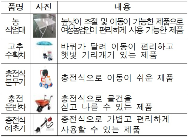 지원 장비는 농작업대, 충전식 분무기·운반차·예초기, 고추 수확차 등이다.