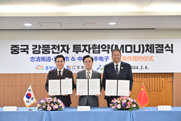 김태흠 지사는 6일 도청 접견실에서 왕쉐쩌 중국 강풍전자 총경리, 박경귀 아산시장과 투자협약(MOU)을 체결했다.