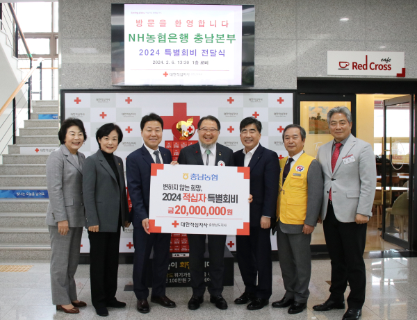 [충청뉴스 권상재 기자] NH농협은행 충남본부는 지난 6일 대한적십자사 충남지사에 도내 취약계층 및 재난 구호활동 지원 등을 위한 2024년 적십자 특별회비 2천만 원을 전달했다.