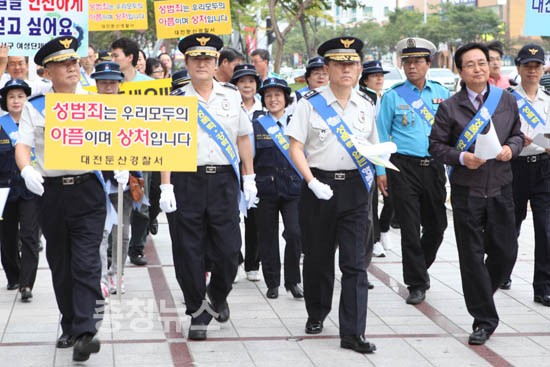 대전둔산경찰서(서장 이병환)는 9월 7일 오후 서구 둔산동 갤러리아 백화점 주변에서 이상원 대전지방경찰청장, 박환용 서구청장, 자율방범대 등 경찰 협력단체원 3백여명이 참석한 가운데 성폭력 없는 안전한 대전지역 조성을 위한 민․경 합동 캠페인을 실시했다.