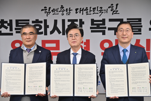 김태흠 지사는 7일 서울 도 중앙협력본부 브리핑실에서 윤영준 현대건설 대표이사, 김기웅 서천군수 등과 서천특화시장 복구를 위한 업무협약을 체결했다.
