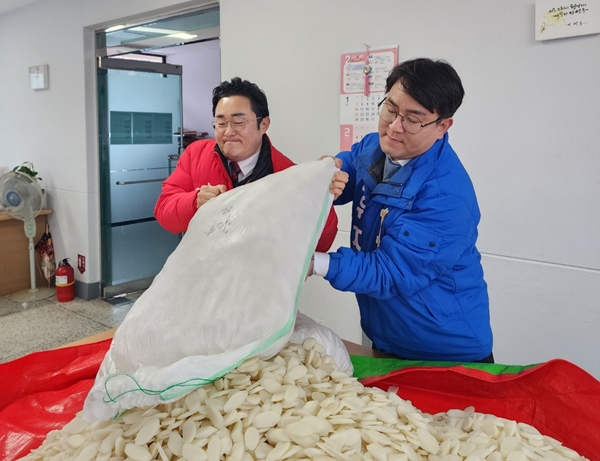 두 청년 예비후보는 이날 독거노인 50여 명을 위해 쌀떡 가마니를 나르거나 부침개를 직접 부치는 등 적극적으로 참여했다.