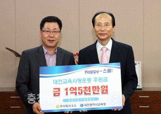 대전광역시교육청(교육감 김신호)은 11일 오전 시교육청 교육감실에서 (주)5.5 김보영 회장을 비롯한 임직원과 교육청 관계자 참석하에 Happy 스쿨! 대전교육사랑운동 후원금 1억5천만원을 기탁받았다.