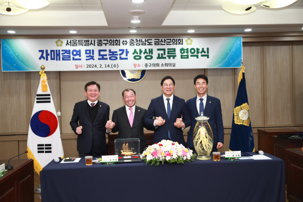 [충청뉴스 금산 = 조홍기 기자] 금산군의회는 지난 14일 서울 중구의회를 방문하고 ‘자매결연 및 도농간 상생 교류 협약식’을 체결했다.