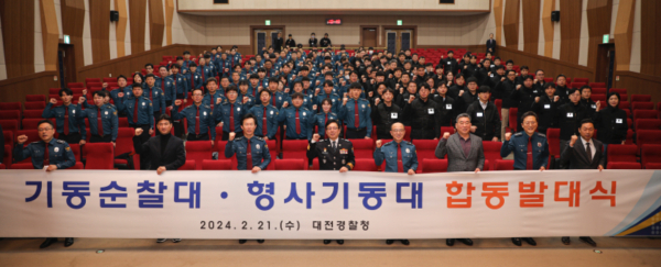 [충청뉴스 김윤아 기자] 대전경찰청은 21일 대전경찰청 김용원홀에서 이상동기범죄, 강력범죄 발생 등 사회 전반 불안감 해소와 시민을 안전을 지키기 위한 ‘기동순찰대·형사기동대 합동발대식’을 개최했다고 밝혔다.