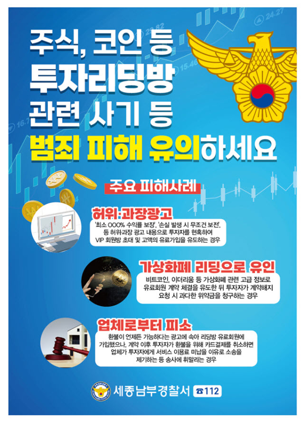 세종남부경찰서(서장 김홍태)는 최근 SNS 투자 리딩방에서 ‘원금과 최소 500% 이상 수익률 보장’, ‘가상화폐 관련 고급 정보 제공’ 등 허위・과장 광고에 속아 큰돈을 사기 당했다는 사건 약 20여 건을 수사하고 있다고 21일 밝혔다.