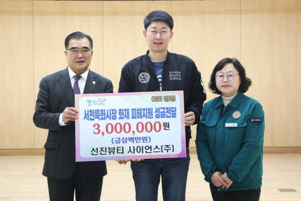 [충청뉴스 서천 = 조홍기 기자] 서천군 소재 선진뷰티사이언스㈜(대표 이성호)가 지난 21일 서천특화시장 화재 피해지원을 위해 성금 300만원을 서천군청에 전달했다.
