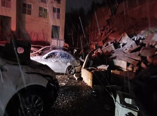 [충청뉴스 권상재 기자] 22일 오전 3시 20분경 충남 태안군 태안읍 평천리의 한 아파트 단지 내 20m높이의 옹벽이 무너져 차량 9대가 파손되는 사고가 발생했다.