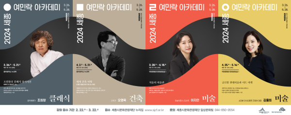 [충청뉴스 최형순 기자] 세종시문화관광재단은 2024년 세종여민락아카데미 상반기 정기강좌 수강생을 모집한다.