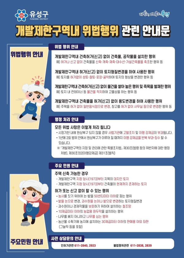 현재 유성구의 개발제한구역은 대전시(304,082㎢)의 34%(104,116㎢)로 대전 5개구 중 가장 넓은 면적을 차지하고 있으며, 매년 불법행위 및 주민요구가 증가함에 따라 민원 및 단속 등을 유연하게 처리하고자 올해부터 “개발제한구역 단속업무 처리지침”을 시행하고 있다.