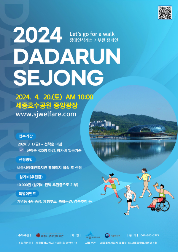 [충청뉴스 최형순 기자] 세종시장애인복지관(관장 윤용식)은 4월 20일 장애인의 날을 기념하여 ‘2024 DADARUN SEJONG’ 걷기대회를 4월 20일(토) 오전 10시 세종호수공원에서 개최한다. 이번 대회는 세종특별자치시, 복권위원회가 지원하고 세종시장애인복지관이 주최·주관한다.