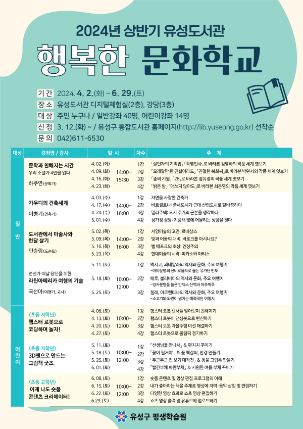 [충청뉴스 박영환 기자] 대전 유성구(구청장 정용래)는 4월 2일부터 6월 29일까지 유성도서관에서 지역주민을 대상으로 '2024년 상반기 행복한 문화학교'를 운영한다고 밝혔다.