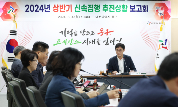 [충청뉴스 박영환 기자] 대전 동구(구청장 박희조)는 4일 동구청 중회의실에서 고현덕 부구청장 주재로 전 부서 간부 공무원 32명이 참석한 가운데 ‘2024년 1분기 신속집행 보고회’를 열고 추진 상황을 점검했다.