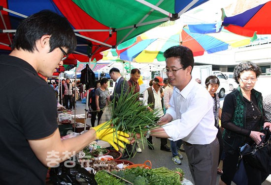 ▲ 유성 허태정 구청장이 추석명절 제수용품 전통시장에서 구입하고 있다