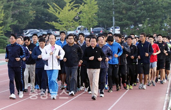 염홍철 대전시장은 25일 대전체육고등학교에서 제93회 전국체전에 출전하는 16개 종목 197명의 선수 및 관계자들과 아침운동을 함께하며 선수단을 격려했다.