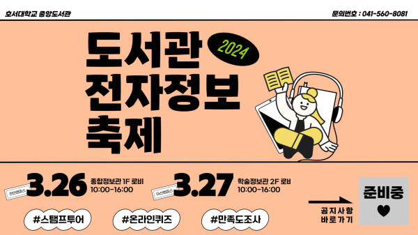 [충청뉴스 박동혁 기자] 호서대학교는 새 학기를 맞아 오는 26~27일 각 캠퍼스 도서관에서 ‘도서관 전자정보 축제’를 개최한다고 12일 밝혔다.
